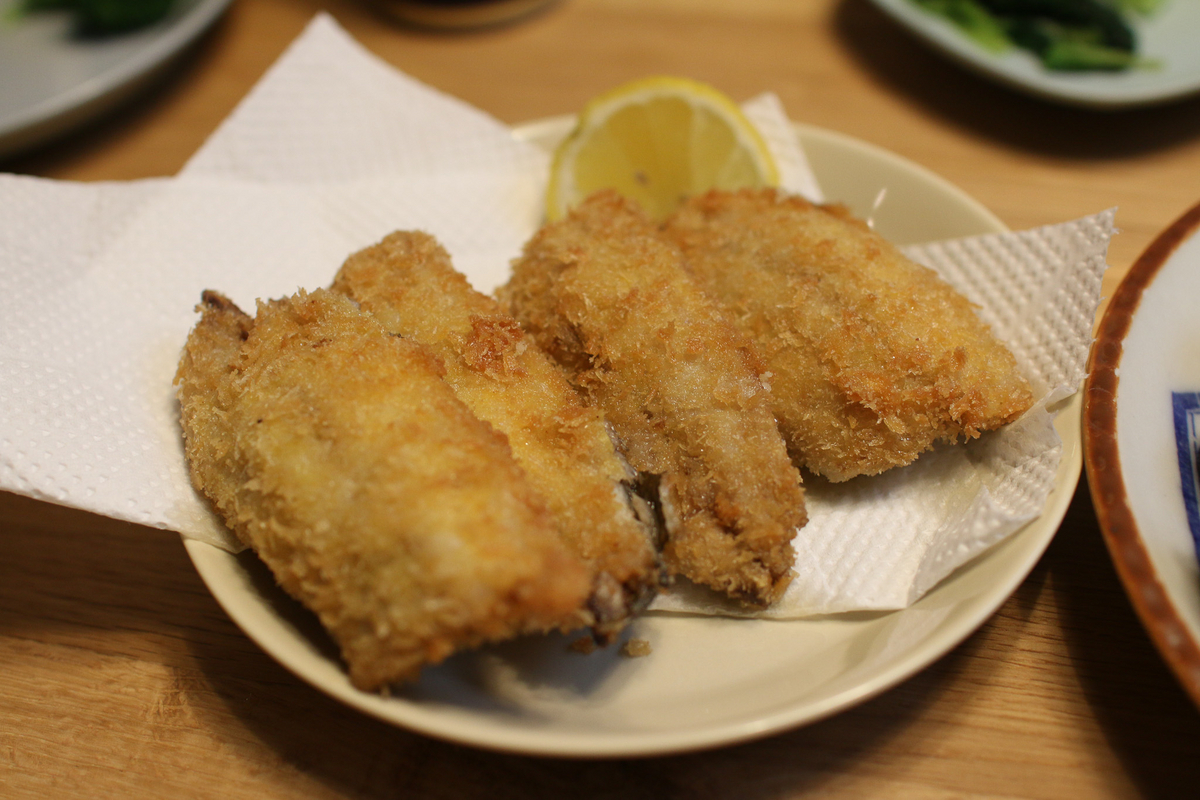 夕飯。鯵が安かったので刺身用にでかいやつ、アジフライ用に小さいやつを購入した。子の揚げ物への食いつきが凄まじく、Aは油を加熱している時から「唐揚げの匂いがする」と言っていた。